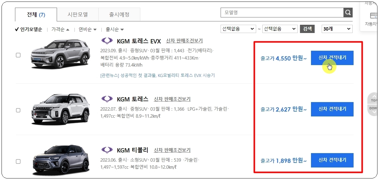 우리가 선택한 조건을 충족하는 쌍용자동차 모델에 대한 신차가격표가 여러 개 나타났습니다. 여기에 나와 있는 금액은 기본 가격을 표시한 것인데요. 앞서 확인해 본 바와 같이 이것은 실제 구매 비용과 차이가 있습니다. 그렇기 때문에 정확한 가격표 확인을 위하여 가격표에 있는 "신차 견적내기" 버튼을 클릭해 주세요.