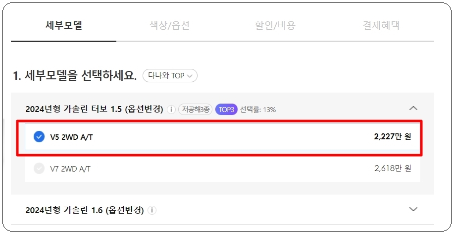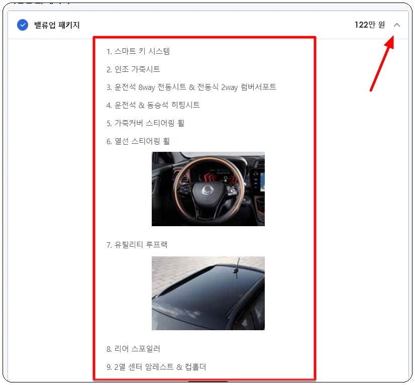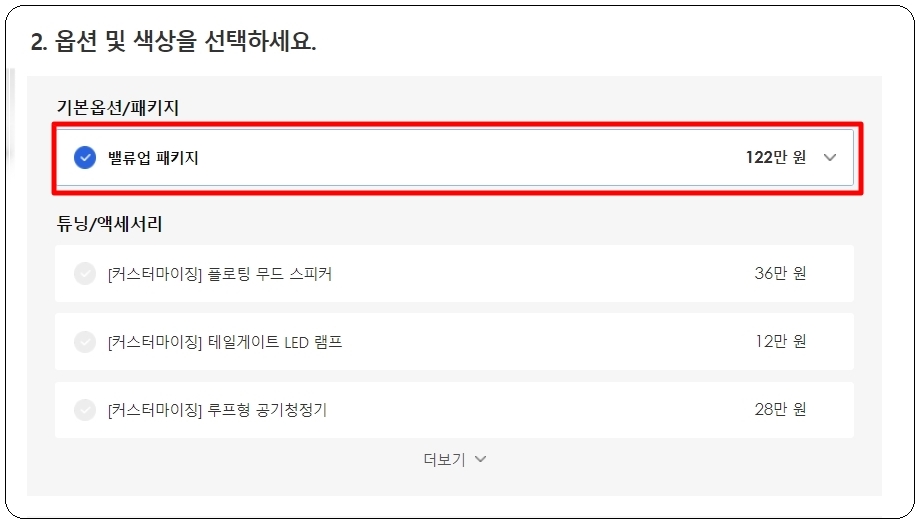 네 가지 기준을 중심으로 자신에게 맞는 것을 선택하면 되는데요. 가장 먼저 세부 모델입니다. 세부 모델 선택 이후에는 신차에 추가하고 싶은 옵션이나 튜닝 및 액세서리를 선택해 주세요. 옵션의 경우에는 가격표 옆에 있는 화살표 버튼을 누르면 자세한 설명을 확인할 수 있습니다.