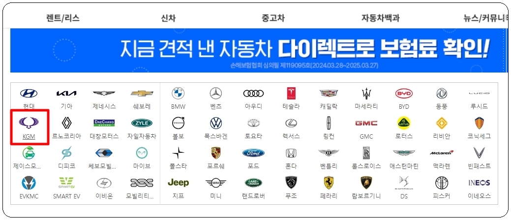 사이트에 접속하면 메인 화면에 여러 가지 자동차 브랜드가 나타나는데요. 여기에서 쌍용자동차의 경우에는 kgm을 선택하면 됩니다.