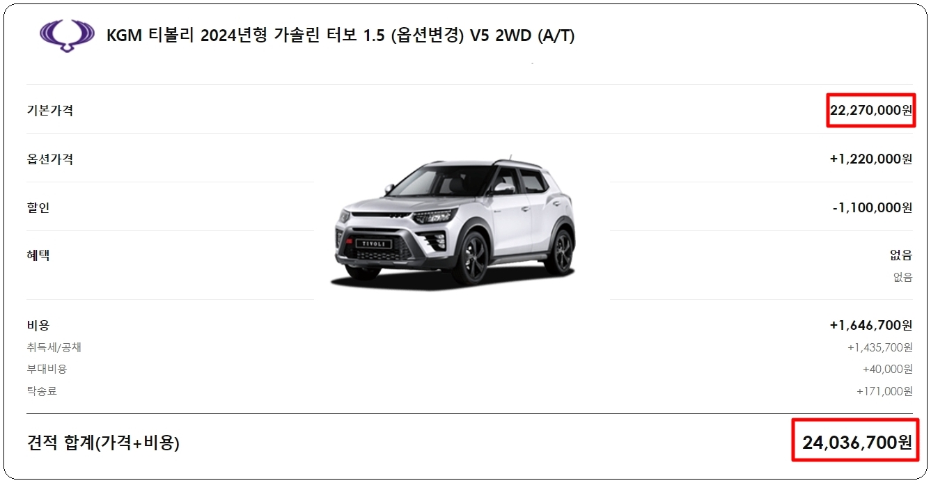 저를 포함 많은 사람들이 KGM을 "쌍용자동차"라고 부르는 경향이 있습니다. 아무래도 오랫동안 쌍용이라는 이름을 갖고 있었기 때문이라고 생각되는데요. 이번 시간에는 해당 브랜드의 신차에 대한 정확한 가격표를 알아보겠습니다. 제가 하는 방식대로 따라하면 실제로 구매할 때 얼마에 비용이 발생하는지 정확하게 예상할 수 있습니다.