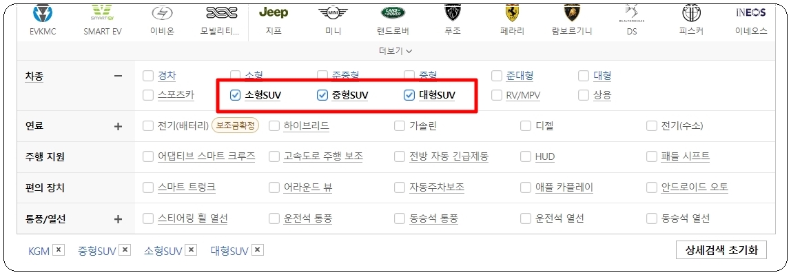 새롭게 열린 페이지에서 보면 여러 가지 자동차 조건이 나타납니다. 자신이 선호하는 차종, 연료, 주행 지원, 편의장치, 통풍 및 열선 여부를 선택해 주세요. 그럼 이에 맞는 쌍용자동차 모델을 손쉽게 찾을 수 있습니다.