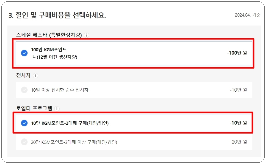 세 번째 단계에서는 할인 및 구매 비용에 관련된 것인데요. 자신이 이용할 수 있는 할인 조건을 선택하면 됩니다. 보통 신차를 구매할 때는 전시차를 선택하는 경우 추가 할인을 받을 수 있는데요. 전시차를 선택하면 옵션 변경이 어렵지만, 일반적인 신차보다 더 빨리 받을 수 있다는 장점이 있습니다.