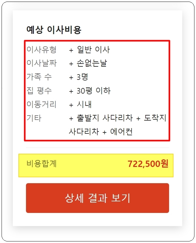 결과를 확인했는데요. 제가 입력한 항목을 바탕으로 예상 비용을 얻을 수 있었습니다. 자세한 견적표 내용도 확인이 가능하죠. 상세 결과 보기 버튼을 눌러 보세요. 그럼 예상 비용에서 어떤 요소가 큰 비중을 차지했는지 알 수 있습니다. 추가적인 견적표를 받아 보고 싶다면 이사 견적 비교하기 버튼을 클릭해 주세요.