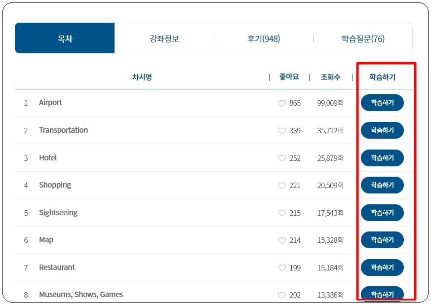 강좌를 선택하면 강좌에 대한정보, 후기, 질문과 답, 목차를 살펴볼 수 있는데요. 목차를 통해 선택한 영어회화 강좌에서 어떤 것을 공부할 수 있는지 알 수 있습니다. 여기서 "학습하기" 버튼을 누르면 바로 강의를 들을 수 있죠. 로그인을 하지 않아도 바로 강의를 들을 수 있다는 것이 정말 편리합니다.
