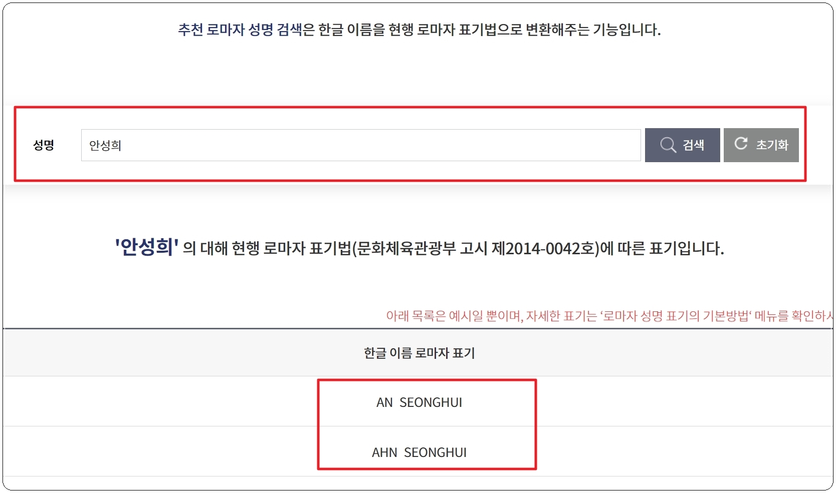 외교부에서 제공하는 영문이름 변환기 서비스도 사용 방법은 간단합니다. 그냥 본인의 성명을 넣은 후 [검색] 버튼을 누르면 돼요. 그럼 하단 부분에 "한글 이름 로마자 표기" 결과가 나타납니다. 이 중에서 하나를 선택해서 사용하면 돼요.