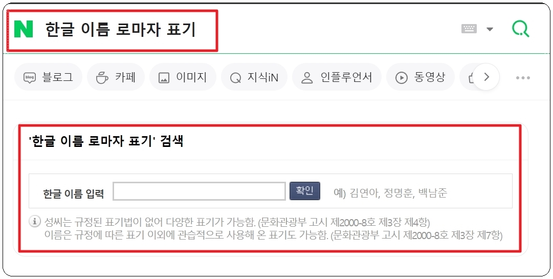 네이버에서는 우리가 이번 시간에 사용할 변환기 프로그램을 무료로 제공하고 있습니다. 간단하게 네이버에서 "한글 이름 로마자 표기"라고 검색하면 해당 프로그램을 찾을 수 있는데요. 사용하는 방법은 매우 간단합니다. 영문으로 바꿀 성명을 입력한 후 [확인] 버튼을 눌러주세요.