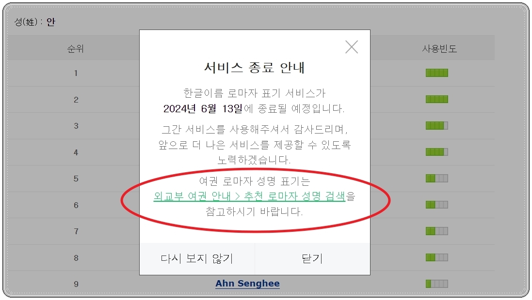 안타깝게도 네이버에서 제공하는 한글이름 로마자 표기 서비스는 2024년 6월 13일에 종료가 될 예정이라고 합니다. 이를 대신할 수 있는 외교부의 서비스가 있는데요. 다음 링크를 통해 추천 로마자 성명 검색 페이지에 접속해 보겠습니다.