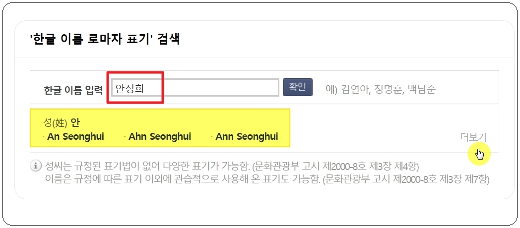 저는 "안성희"라는 성명을 변환기 서비스에 넣었는데요. 이에 따라 3개의 영문 표기를 받아볼 수 있었습니다. 이 중에서 어떤 것을 골라야 할까요? 잘 모르겠으면 변환기 프로그램에서 우측 하단에 있는 [더보기] 버튼을 클릭합니다.