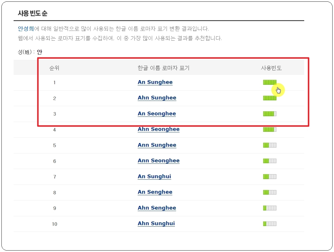 많은 사람들이 이용한 빈도에 따라 영문이름에 대한 순위를 매긴 자료가 나타나는데요. 가장 사용빈도가 높은 것을 고르는 것이 좋습니다. 좀 더 신중하게 결정하고 싶은 분들은 순위표에 나온 영문이름을 마우스로 클릭해 보세요.