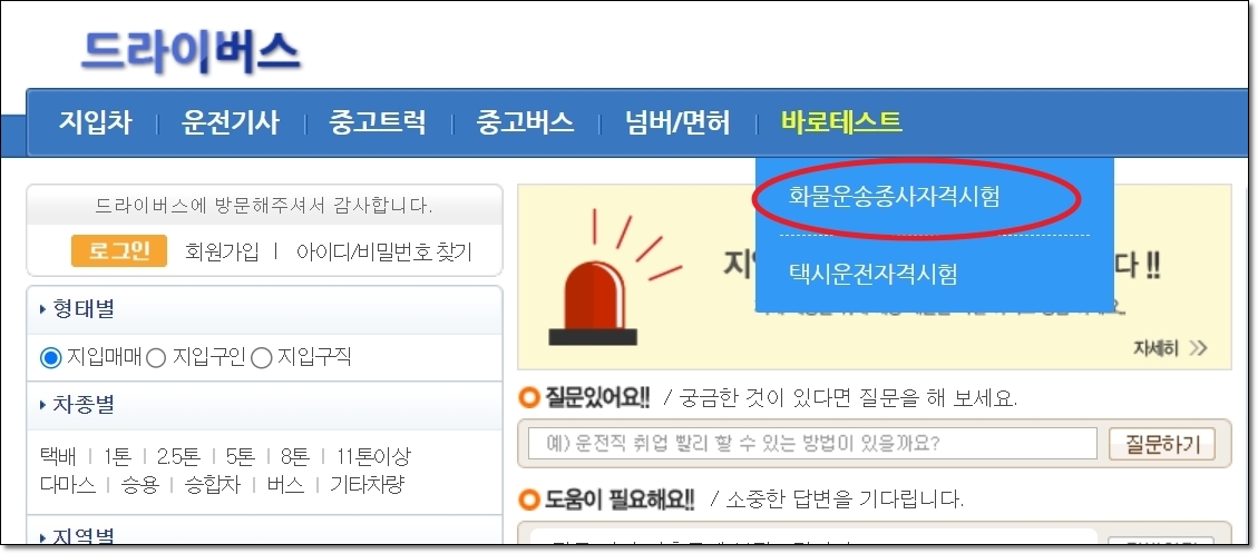 드라이버스 사이트에 접속했습니다. 메뉴에서 가장 우측에 있는 "바로테스트"를 선택합니다. 그럼 2가지 하위 메뉴가 나타나는데요. 여기에서 "화물운송종사 자격시험"을 선택해주세요.