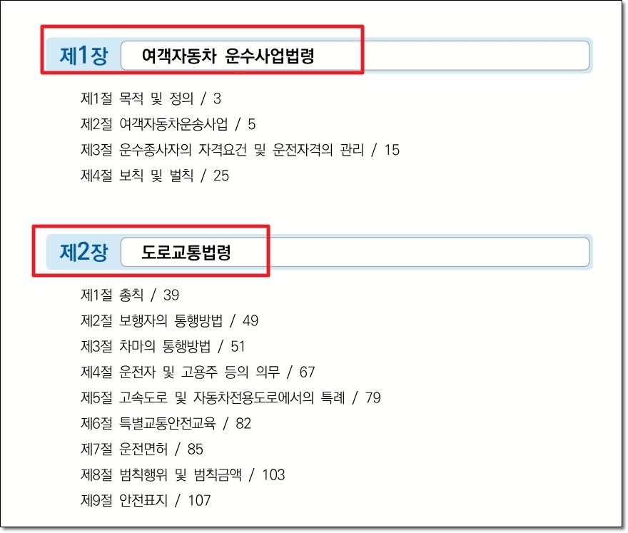 첫 번째 과목인 "교통 및 운수 관련 법규 및 교통사고 유형"에 대한 수험용 참고자료를 열어보았는데요. 목차를 보면 버스운송 일을 할 때 꼭 숙지해야 하는 내용으로 구성되어 있음을 알 수 있습니다. 여객자동차 운수사업법령, 도로교통법령, 교통사고처리특례법령, 주요 교통사고유형 이렇게 4개의 장으로 구성되어 있네요.