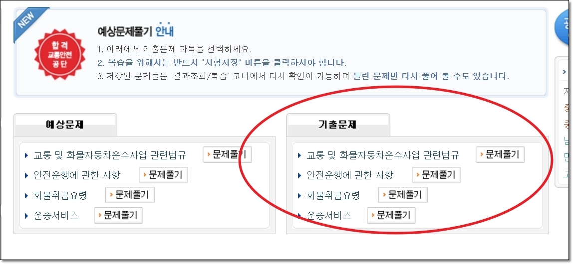 버스가 아닌 화물에 관련된 자격시험을 선택해서 의아해 하셨을 텐데요. 일단 새롭게 열린 페이지에서 "기출문제 풀기" 메뉴를 선택해 보세요.