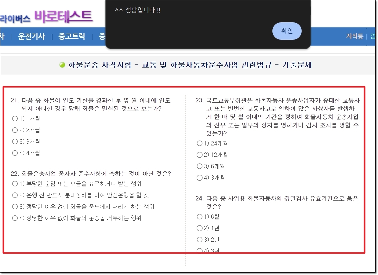 여러 과목을 선택할 수 있는 페이지가 열렸습니다. 여기를 보면 앞서 살펴보았던 버스운송 자격시험을 구성하는 4가지 과목 중 3가지 과목을 풀어볼 수 있도록 되어 있네요. 이런 식으로 완전히 같지는 않지만, 상당 부분 같은 기출문제 자료를 이용할 수 있습니다.