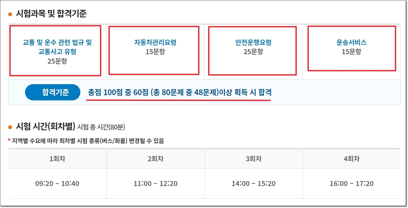 해당 시험의 경우 4개의 과목으로 구성이 되어 있습니다. 과목에 따라 "교통 및 운수 관련 법규 및 교통사고 유형"은 25문항, "자동차 관리 요령"은 15문항, "안전운행 요령"은 25문항, "운송 서비스"는 15문항 이렇게 총 80개의 문항으로 출제가 되는데요. 여기에서 48문제, 60점 이상을 획득해야 합격입니다.