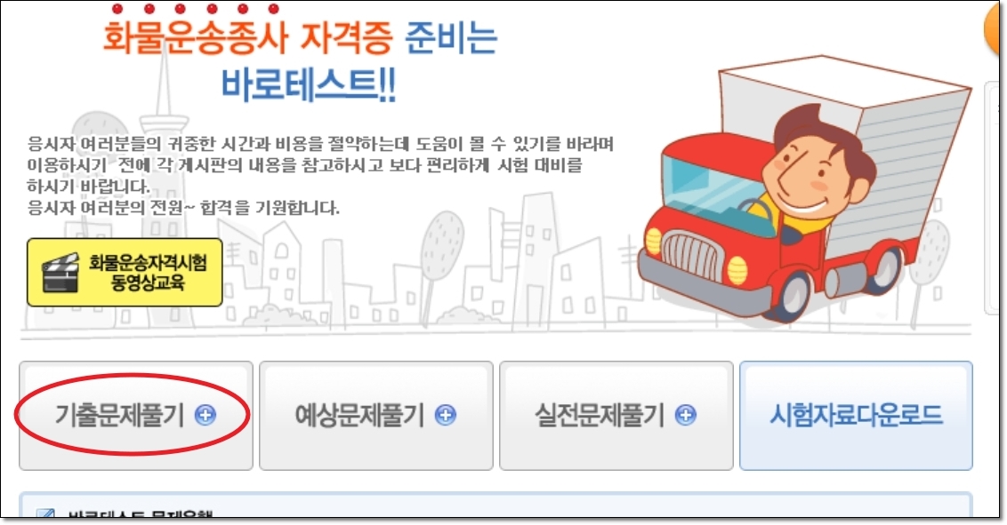 버스가 아닌 화물에 관련된 자격시험을 선택해서 의아해 하셨을 텐데요. 일단 새롭게 열린 페이지에서 "기출문제 풀기" 메뉴를 선택해 보세요.
