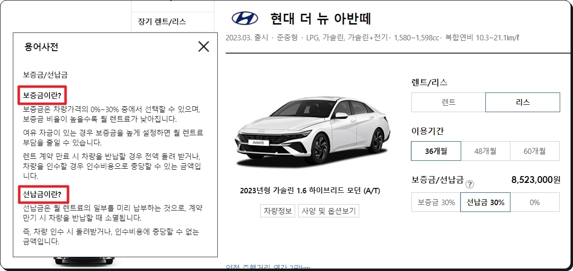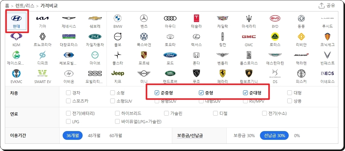 월 비용을 확인하고 싶은 자동차 모델을 선택할 차례인데요. 관심 있는 브랜드, 차종, 연료 타입, 이용기간, 보증금이나 선납금 설정 여부를 선택해 주세요. 저는 준중형, 중형, 준대형에 속하는 현대차를 선택했습니다. 기간은 36개월이고요.