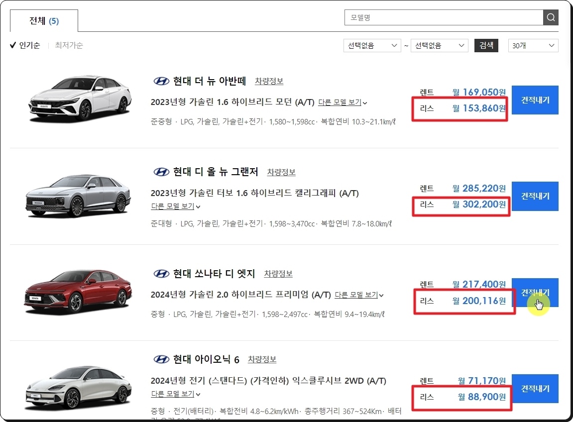 5개의 차량 모델이 검색이 되었는데요. 월 기준으로 된 렌트와 리스가격표가 나타났습니다. 여기 나온 금액은 기본값이기 때문에 옆에 있는 [견적내기] 버튼을 눌러 자신의 상황이나 선호도에 맞는 결과를 확인해 보는 것이 좋아요.