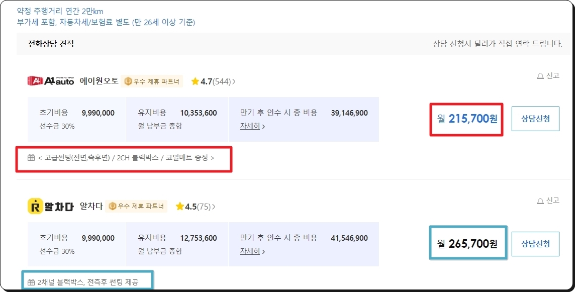 조건 지정이 끝났다면 리스가격표 아래에 있는 업체 리스트도 확인해 보세요. 각 업체에서 제시하는 월 비용이나 제공하는 혜택을 확인할 수 있어요. 상담 신청도 할 수 있고요.