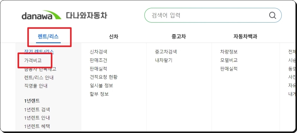 다나와 자동차 사이트에 접속하면 메뉴에서 [리스]와 [가격비교]를 선택해 주세요. 보시는 바와 같이 신차, 중고차, 렌트에 관련된 정보도 제공하고 있습니다.