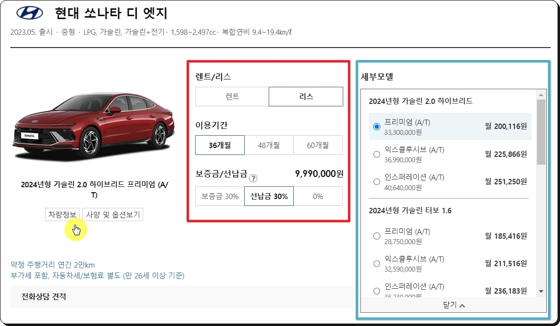 추가 선택을 할 수 있는 페이지가 열렸는데요. 같은 자동차 모델이라고 하여도 세부등급에 따라서 나타나는 금액이 달라집니다. 그런 것처럼 월 비용도 이렇게 달라요. 이용기간, 보증금, 선납급, 세부등급을 조절해보면서 자신에게 맞게 리스가격표를 조정해 보세요.