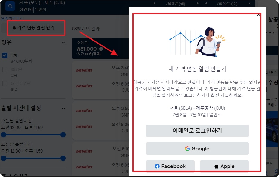 제가 알려드린 노하우를 따라서 진행했음에도 불구하고, 마음에 들 정도로 싼 가격의 항공권을 찾지 못한 분들이 계실 텐데요. 그런 경우에는 [가격 변동 알림 받기] 버튼을 눌러보세요. 싼 가격의 티켓이 나타났을 때 알림을 받을 수 있어요. 알림을 받은 즉시 특가로 나온 티켓을 예매하면 됩니다.