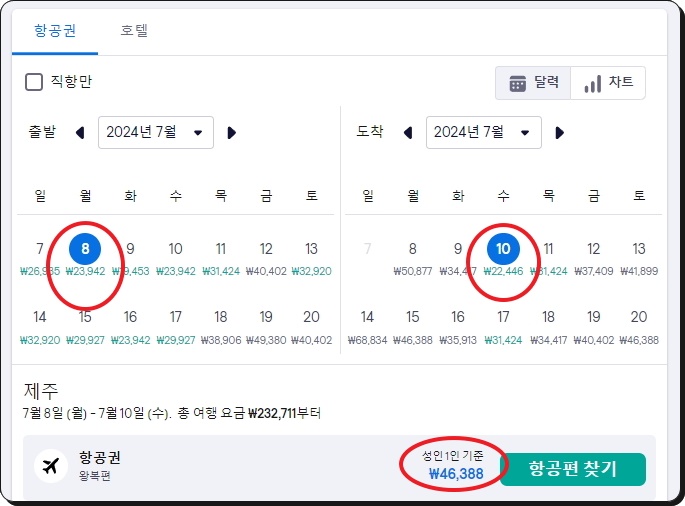 검색 버튼을 누르면 이와 같이 달력 모양의 저가항공권에 대한 가격표가 나타납니다. 여기에 있는 가격을 살펴보고, 날짜를 조율해 보세요. 저는 왕복으로 46,388원에 다녀올 수 있는 티켓을 찾았네요.