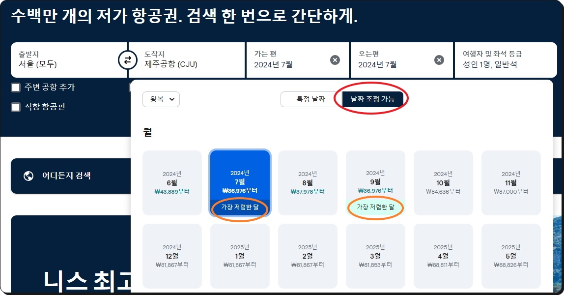 스카이스캐너를 통해 최대한 저렴한 저가항공권을 찾아서 예매를 진행해 보도록 하겠습니다. 일단 도착지와 날짜를 입력해야 하는데요. 도착지는 많은 티켓을 비교할 수 있는 제주공항을 선택하겠습니다. 날짜의 경우에는 [날짜 조정 가능] 탭을 선택한 상태에서 [가장 저렴한 달]을 선택하면 됩니다. 아무대로 가장 저렴한 달에 사는 티켓이 저렴할 가능성이 높아요.