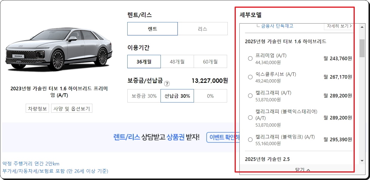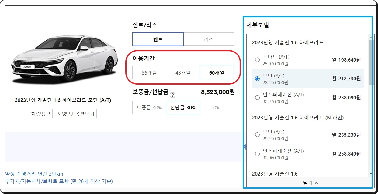 그럼 세부모델 그러니까 "트림"이라고 불리기도 하는 조건을 설정해 보세요. 같은 모델의 차량이라고 하여도 세부모델에 따라 옵션이나 내장 재질 등에 있어서 차이가 납니다. 그렇기 때문에 월 렌트카 비용도 세부모댈에 따라 달라요.