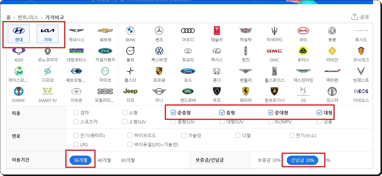 새롭게 열린 페이지를 보면 여러 가지 조건을 선택할 수 있도록 되어 있습니다. 가장 먼저 선호하는 자동차 브랜드를 선택해 주세요. 복수 선택도 가능합니다. 그 다음 차종, 연료 타입, 이용 기간, 보증금 및 선납금 여부 지정이 가능해요.