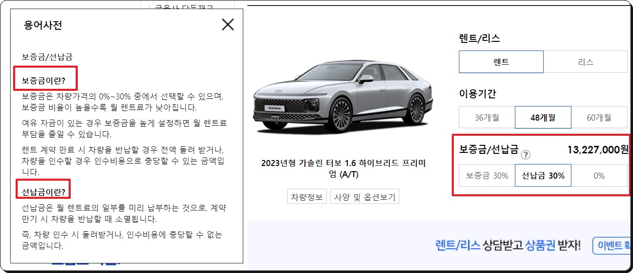 저는 "현대 디 올 뉴 그랜저"를 선택했습니다. 여기서 한번 더 조건 설정이 가능한데요. 보증금과 선납금에 대해 헷갈리는 분들을 위해 이에 대한 정의와 차이점이 설명되어 있네요. 간단히 말해서 보증금은 나중에 돌려 받을 수 있고, 선납금은 말 그대로 월 렌트카 이용료에 대해 일부를 미리 지급한 것이기 때문에 나중에 돌려 받을 수 없는 돈 입니다.