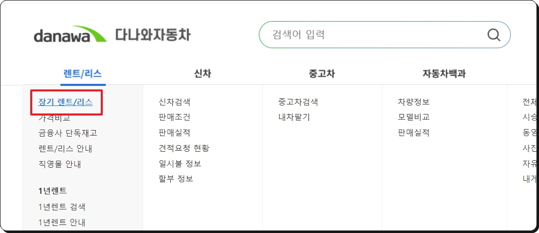 앞서 설명드린 시스템을 이용하기 위해서 다나와 자동차 사이트를 이용해야 하는데요. 이곳은 신차나 중고차를 구매할 때도 도움이 되지만, 리스 차량이나 렌트카를 알아보고자 할 때도 꽤 유용합니다.