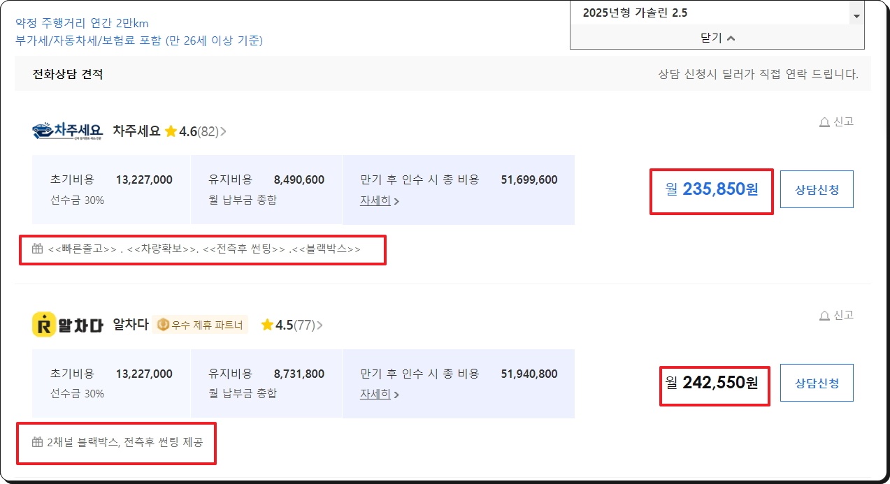 방금 살펴본 장기대여 렌트카 요금표 아래에는 이렇게 업체별 견적 리스트가 있습니다. 해당 리스트에서 마음에 드는 조건이 있으면 상담을 통해 서비스 이용 문의를 하는 것도 가능해요.