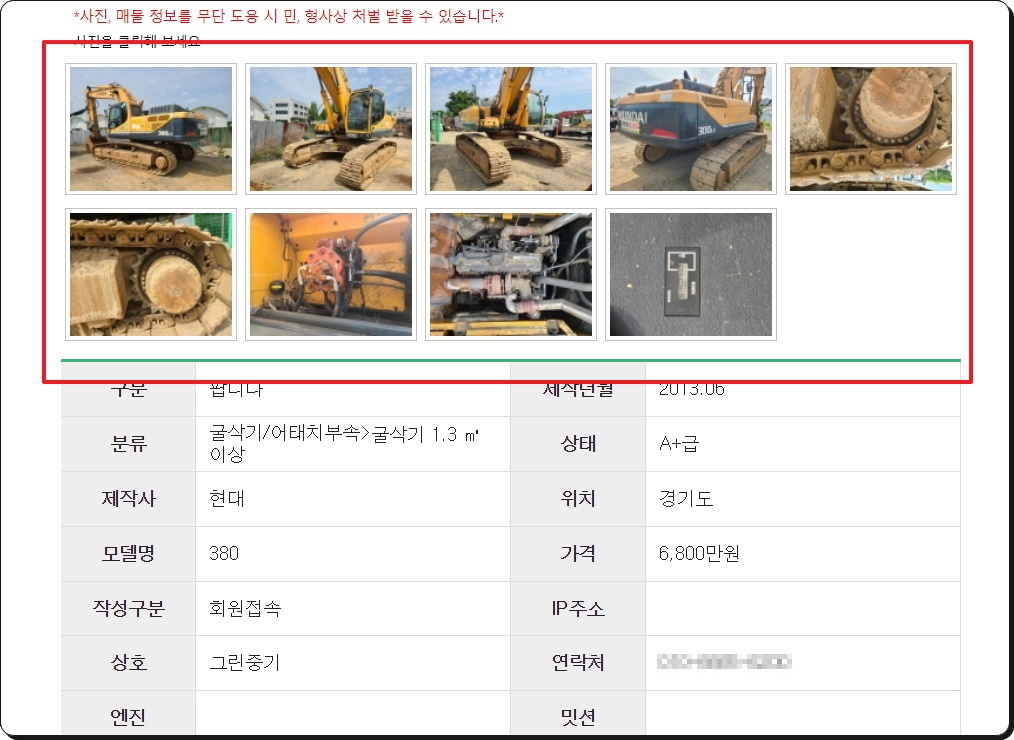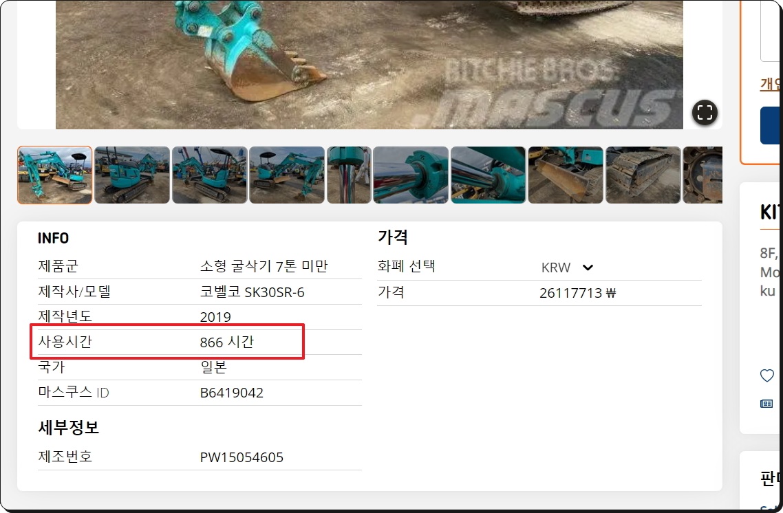 이곳에서도 풍부한 사진 자료와 함께 각 매물에 대한 상세한 스펙 정보를 제공하고 있는데요. 중기에 대한 사용 시간도 표시되어 있어서 마음에 드네요. 물론 이러한 시간이 매물에 대한 상태를 제대로 표현하는 것은 아니지만 그래도 거래를 할 때 참고할 만하다고 생각합니다.