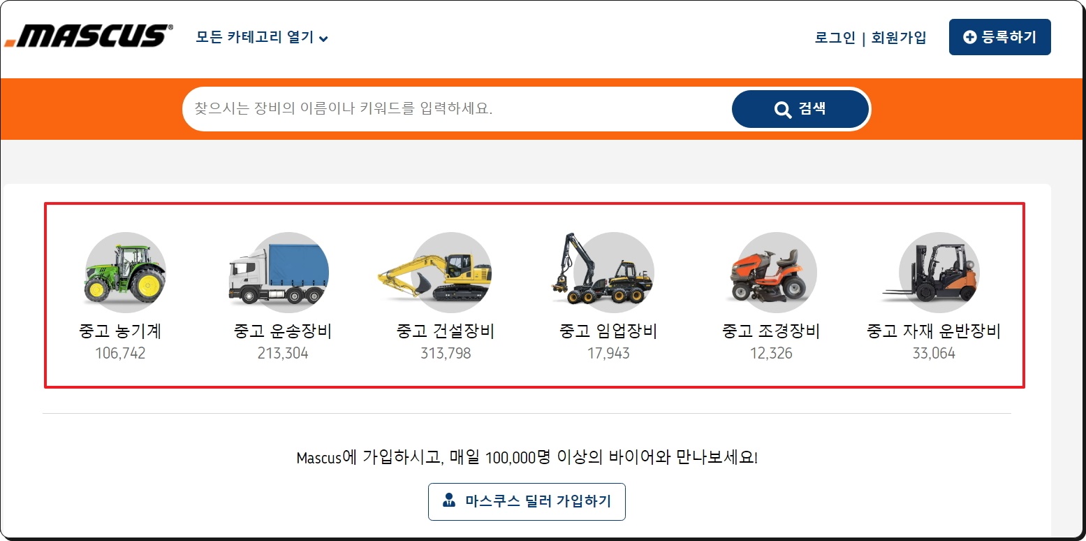 이곳의 경우에는 여러 중기에 대하여 농기계, 운송 및 건설 장비, 임업 및 조경 장비, 자재 운반 장비와 같은 카테고리로 크게 분류를 해 놓았네요. 장비의 이름이나 관련 있는 키워드를 검색하는 방법으로 매물을 찾아보는 것도 가능합니다. 마스쿠스에 가입하는 경우 매일 100,000명 이상의 바이어를 만나볼 수 있다고 하는데, 거래를 많이 하는 분이라면 가입은 필수라고 생각됩니다.