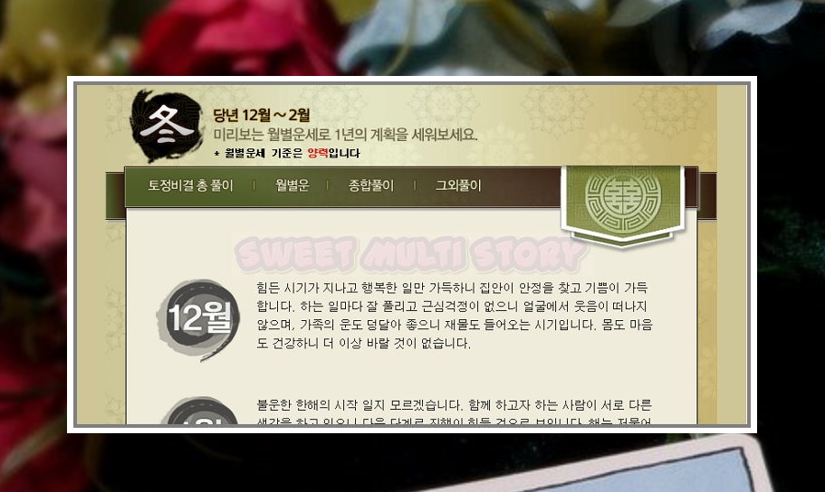 사이트에서 제공하는 토정비결은 당해년도(2017년) 월별운에 자세히 알려줍니다. 매월마다 내게 어떤 일이 일어날지 기대하며 읽어보세요.