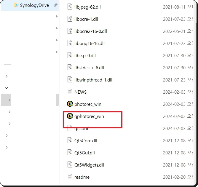 다운로드 받은 파일은 압축이 되어 있는데요. 반디집이나 알집과 같은 프로그램을 이용하여 압축을 해제해 주세요. 그럼 폴더가 하나 나타나고, 그 안에 여러 개의 실행 파일이 있습니다. 그 중에서 블랙박스 복구에 사용하기 편한 [QPHOTEREC_WIN]을 선택하여 실행해 주세요.