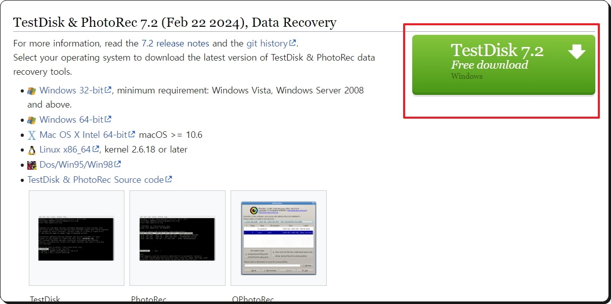 다운로드 페이지에 접속했습니다. 이곳에서는 2가지 복구 프로그램을 다운 받을 수 있는데요. 아랫쪽에 있는 것은 베타 버전이고, 위쪽에 있는 것은 정식 버전입니다. 안정성을 중요하게 여기는 저는 위쪽에 있는 [TestDisk 7.2]를 다운 받도록 하겠습니다. 안내에 보면 알 수 있듯이 윈도우는 물론이고, 맥묵이나 리눅스에서 해당 프로그램을 사용할 수 있네요.
