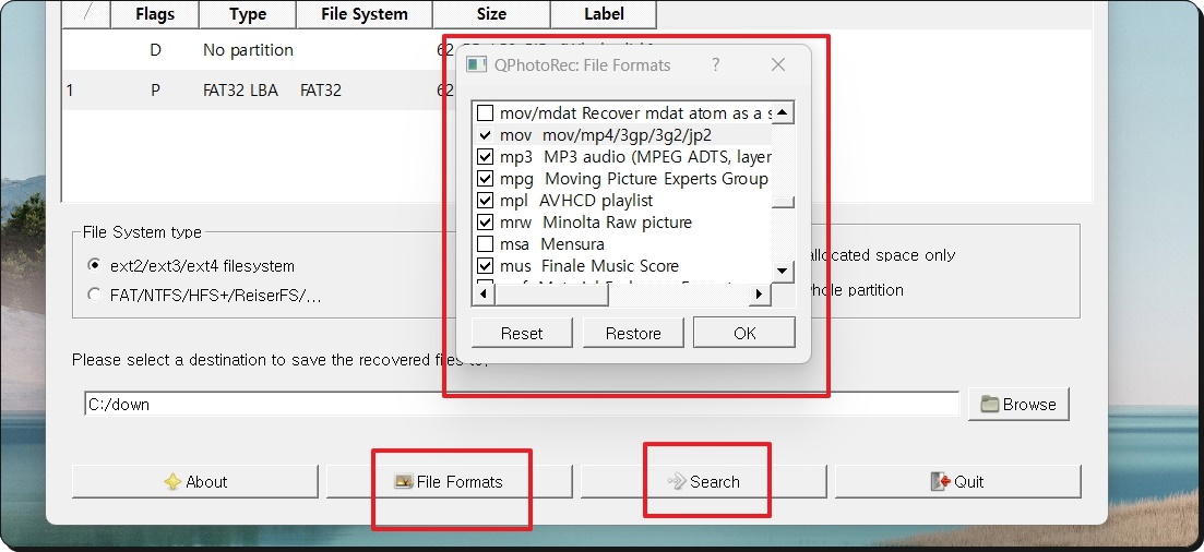 File Fomats 버튼을 누르면 복구를 할 대상이 되는 파일의 확장자를 지정할 수 있는데요. 이것을 지정하지 않으면 다양한 파일이 복구가 되어서 블랙박스에서 자신이 찾으려고 했던 파일을 찾는 데에 시간이 걸릴 수 있습니다. 그렇기 때문에 확장자를 알고 있는 경우라면 꼭 지정해 주세요. 여기까지 진행했다면 [Search] 버튼을 눌러주세요.