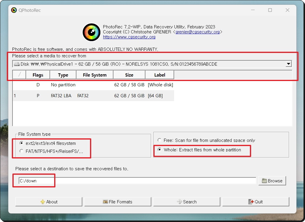 프로그램 실행 화면입니다. 그럼 이것으로 어떻게 블랙박스 복구를 하는지 방법을 알려드리죠. 우선 블랙박스에 들어 있던 SD카드를 컴퓨터에 장착합니다. 그 다음 프로그램 상단에 있는 하드디스크 선택에서 SD카드를 지정해 주세요. 그 다음 파일 시스템 타입, 전체 스캔(Whole), 복구 된 파일 저장할 곳을 지정합니다.