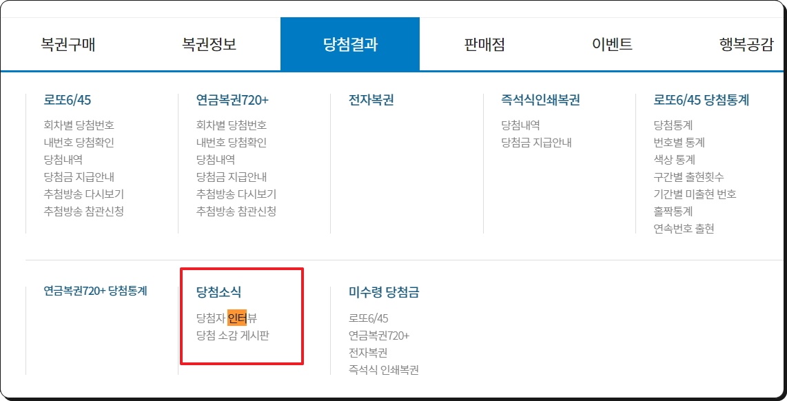 사이트에 접속하면 메뉴에서 [당첨결과]를 선택합니다. 그럼 소식 카테고리에서 [당첨자 인터뷰]를 찾을 수 있는데요. 클릭해 주세요.
