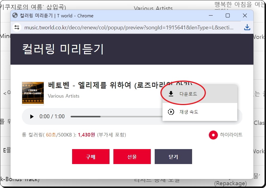 저는 클래식 장르에서 인기 있는 음원을 찾아보았는데요. 여기에서 한 가지 음원에 대한 [재생] 버튼을 눌러보았습니다. 이에 따라 [컬러링 미리듣기] 창이 나타나는데요. 이 상태에서 재생 버튼을 한 번 더 누르면 무료로 들어볼 수 있습니다. 해당 오디오 파일을 다운받기 원한다면 재생바에서 맨 우측에 있는 [점 3개] 버튼을 클릭해 보세요.