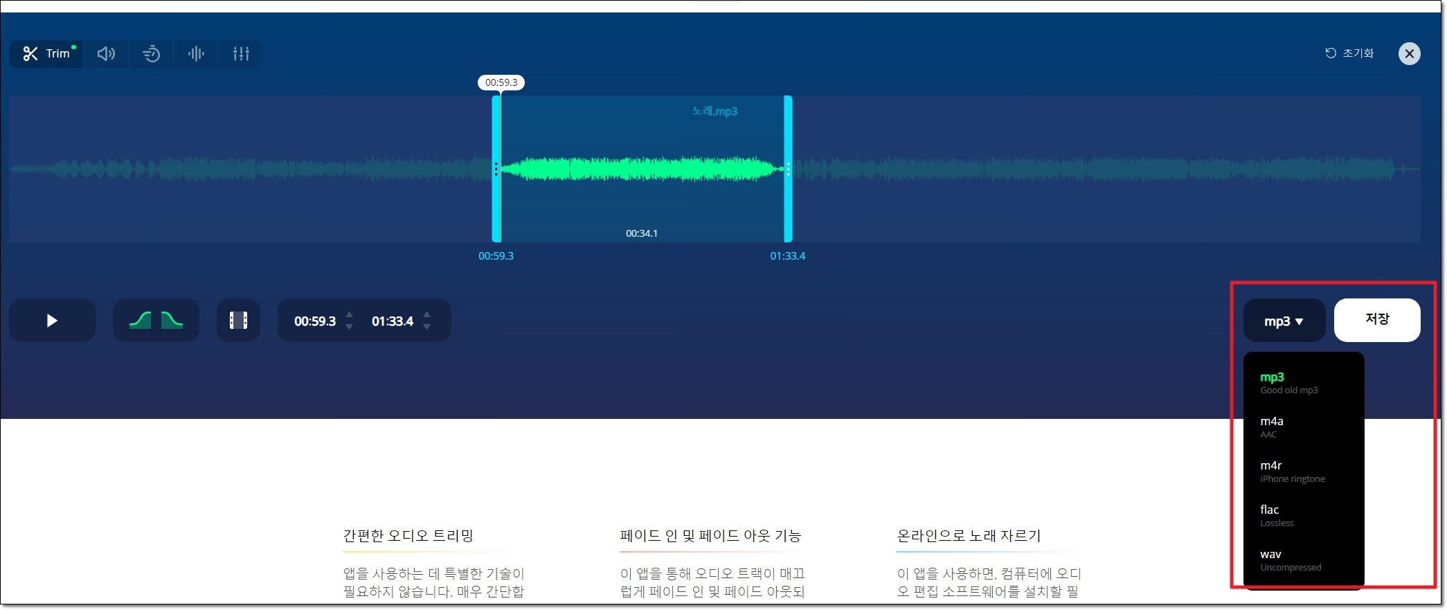 mp3 cutter를 이용하여 벨소리 만들기 작업을 완료했다면 인코딩을 진행해야 하는데요. 우측 하단에 있는 포맷 선택 부분에서 아이폰이나 갤럭시 핸드폰에 맞는 오디오 파일 포맷을 선택해 주세요. mp3, m4a, m4r, flac, wav 이렇게 5가지 포맷으로 변환할 수 있습니다. 포맷 선택 후에는 [저장] 버튼을 눌러주세요. 그럼 인코딩 진행 및 완료가 됩니다.