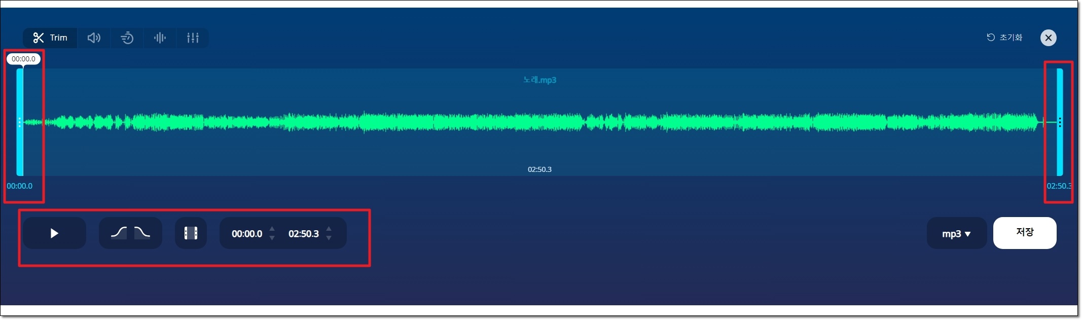 사이트에서 오디오 파일을 추가한 결과입니다. 이렇게 음성에 대한 파형이 그려져 있는 프로그램이 나타나는데요. 간단하게 좌측에 있는 바와 우측에 있는 바의 위치를 옮겨서 벨소리를 만들면 됩니다. 좌측 하단에 있는 버튼은 미리 듣기, 페이드 인 및 아웃 설정, 자르기 기능입니다. 바를 옮길 필요 없이 재생 구간을 숫자로 입력하여 벨소리 범위를 정하는 것도 가능합니다.