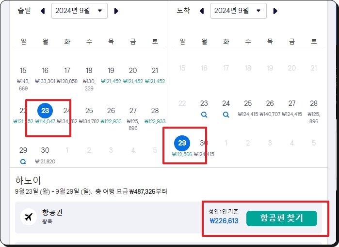 지역을 선택했다면 이번에는 비행기 탑승 날짜를 선택할 차례예요 날짜별로 최저가 베트남 항공권 가격이 표시되어 있는데요 최대한 저렴한 날짜를 선택하면서 국내 여행 스케줄을 따져 보시길 바랍니다 날짜를 모두 선택해 보니 저는 226,613원으로 베트남을 다녀올 수 있는 왕복 티켓을 구할 수 있었어요