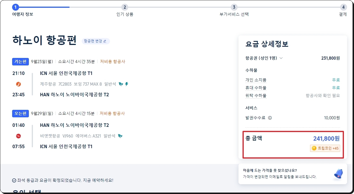 트립닷컴의 베트남 항공권 예약 페이지가 열렸습니다 비행기 일정과 함께 요금 상세 정보를 꼼꼼히 확인해 주세요 그다음부터는 안내에 따라 진행하면 됩니다.