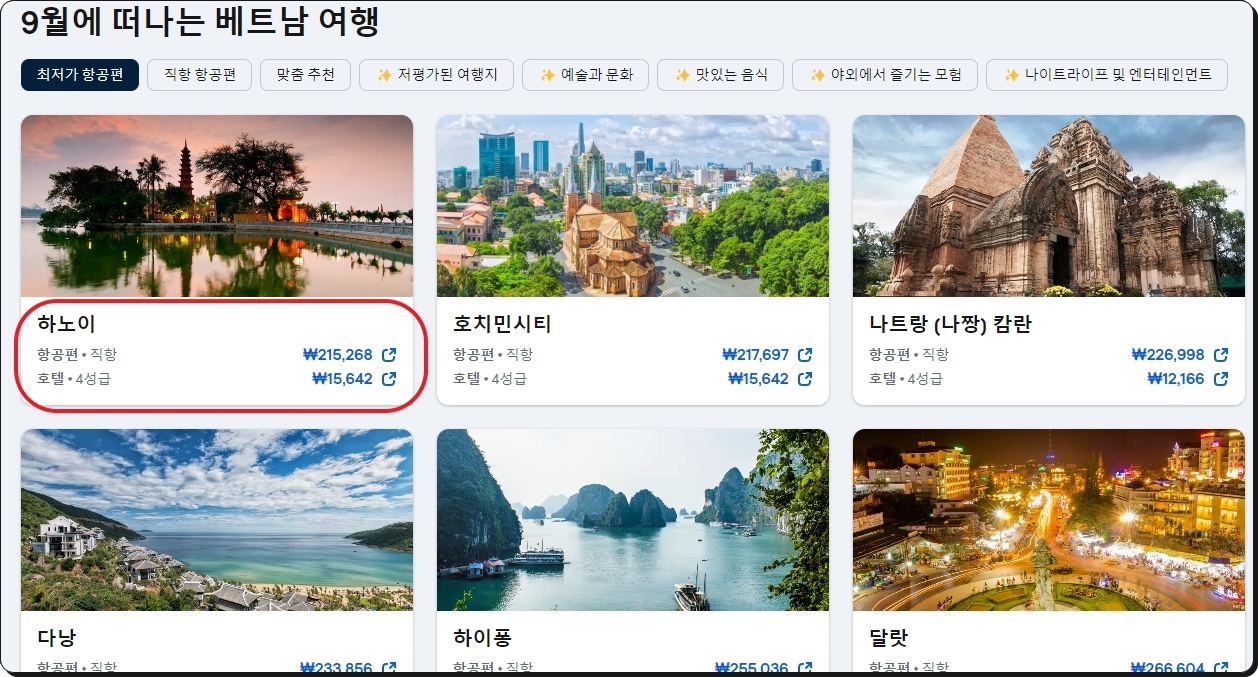 도착지를 베트남으로 지정하였기 때문에 다음과 같이 지역별로 항공권 가격을 알아볼 수 있는데요 여기 표시된 가격은 최저가 금액을 의미합니다 하노이 호치민 시티 나트랑 캄라인 다낭 하이퐁 달랏 순으로 저렴하네요 이번 시간에는 가장 저렴하게 다녀올 수 있는 하노이를 선택해 보도록 하겠습니다