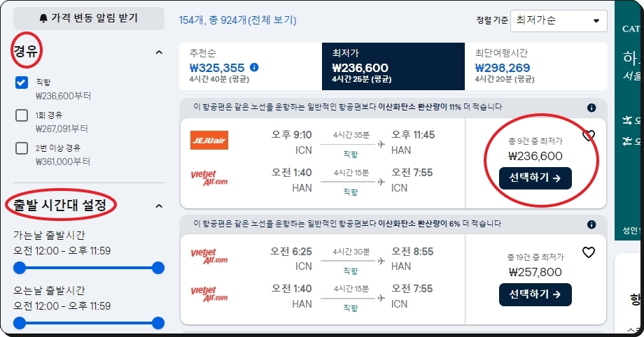 날짜를 골랐다면 이번에는 출발 시간대를 선택해야 하는데요 아무래도 사람들이 많이 선호하는 시간대의 경우에는 베트남 가격이 항공권 비쌉니다 추가적으로 선호하는 항공사가 있다면 그 부분도 감안해 주세요 마지막으로 마음에 드는 항공권을 찾으면 선택하기 버튼을 누릅니다.