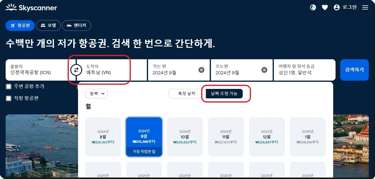 스카이스퀘어 사이트 이용하여 최저가로 판매 되는 항공권을 찾아보도록 하겠습니다 출발지의 경우에는 자신에게 가장 가까운 공항을 선택하면 되고 우리나라에 거주하신다면 베트남을 가기 위해서는 인천국제공항을 꼭 선택해야 합니다 이 다음 도착지는 베트남을 측정하고 가는 편과 오늘 편의 경우에는 날짜 조정 가능 탭을 선택한 다음 가장 저렴한 달을 지정해 주세요