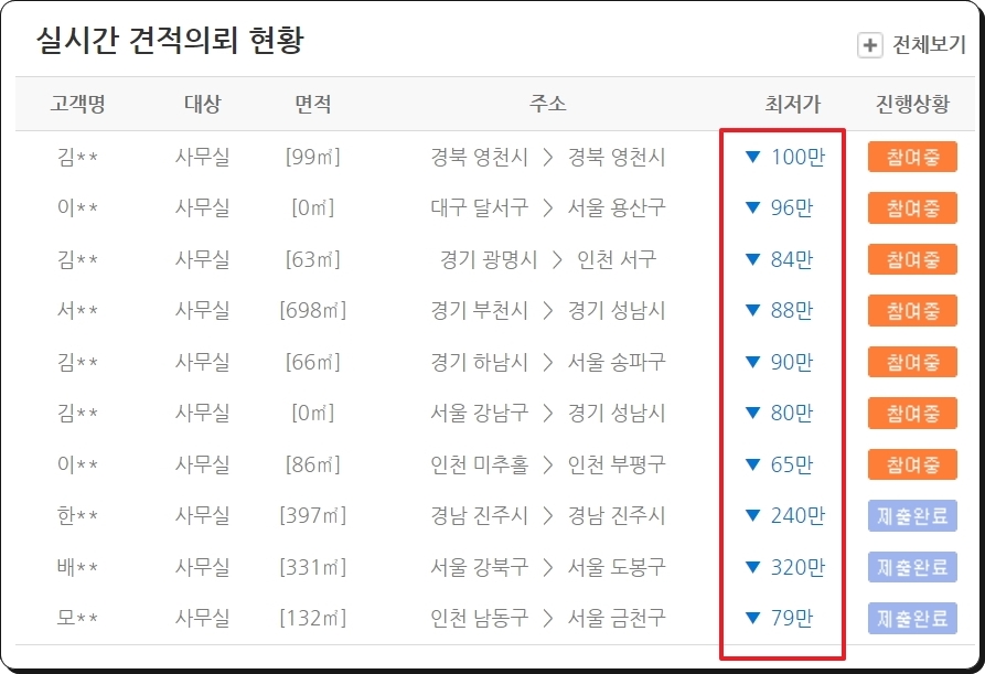 다음 리스트를 보면 면적과 이동 거리에 따라 어느 정도의 사무실 포장이사 비용이 발생하는지 감을 잡을 수 있습니다. 이러한 데이터를 바탕으로 스마트하게 시세 분석이 가능한데요. 리스트에서 자신과 조건이 유사하다고 생각되는 견적을 선택하면 이렇게 포장이사 여부도 확인할 수 있습니다. 보통 견적 비교를 할 때 두세 개 정도만 하게 되는데요. 이러한 데이터를 활용하면 수백 개까지 견적 비교가 가능합니다. 당연히 시간도 1분이면 될 정도로 신속하게 결과를 얻을 수 있죠.
