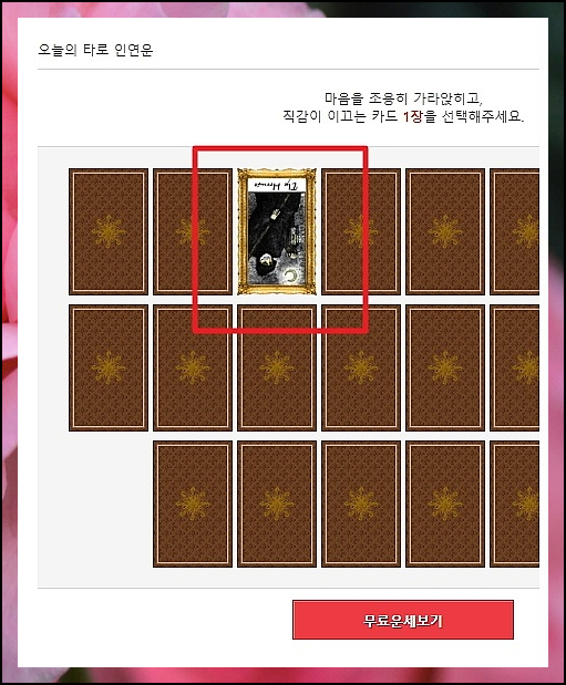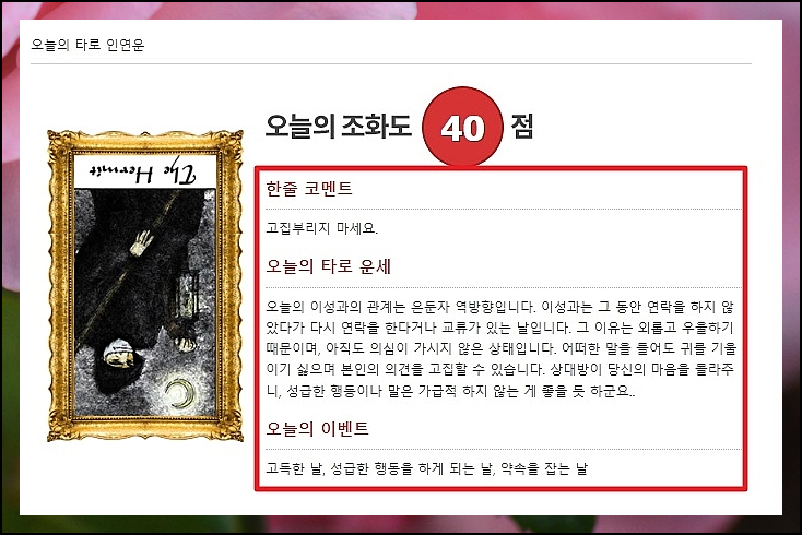 마지막으로 타로를 통해서도 인연 운을 살펴볼 수 있는데요, 이것은 연인이나 애정에 대한 궁금증이 있을 때 사용하면 정말 좋아요. 점수를 얻을 수 있는데요, 간단하게 길흉을 확인할 수 있는 부분이죠. 오늘의 이벤트 내용을 통해 어떤 것을 하면 좋을지도 추천받을 수 있어요.